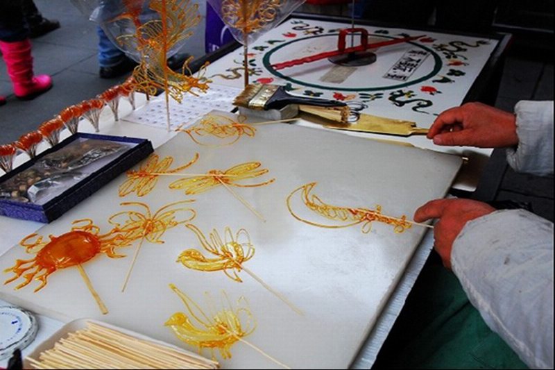 糖画是一种汉族民间手工艺,以糖为材料来进行造型的。所用的工具仅一勺一铲,糖料一般是红、白糖加上少许饴糖放在炉子上用温火熬制,熬到可以牵丝时即可以用来浇铸造型了。在绘制造型时,由艺人用小汤勺舀起溶化了的糖汁,在石板上飞快地来回浇铸,画出造型,民间艺人的手上功夫便是造型的关键。当造型完成后,随即用小铲刀将糖画铲起,粘上竹签。
