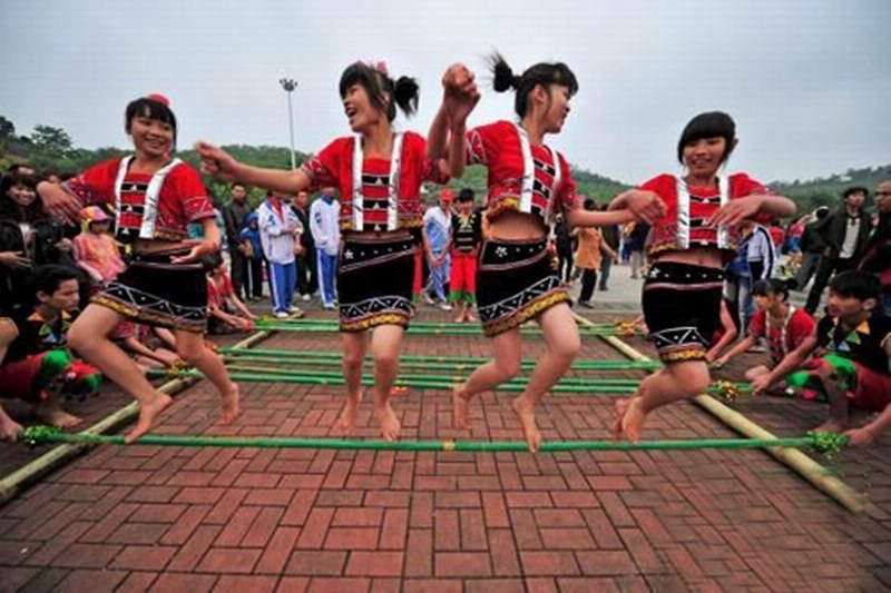 竹竿舞起源:早在宋代,大文学家苏武在结束流放生活离开海南时,得到黎族父老乡亲的"黎歌变舞祝公归"的欢送,写下了"蛮舞与黎歌,余音犹沓沓"的诗句。可见,黎族的歌舞不但历史长,更有其独特的魅力。 黎族人性格豪爽、能歌善舞。黎族的歌舞有其独特的魅力。黎族人喜欢跳"竹竿舞",通常是在庭院或打谷场上跳这种舞。舞时,两边各蹲4个人,每个人双手平握竹竿末端,按节奏张合敲打,舞者随着竹竿的张合,两脚不断上跳下踏,做出各种美妙动作,舞蹈颇为热烈,引人入胜。现在,在海南"竹竿舞"已成为海南最富有特色的舞蹈。