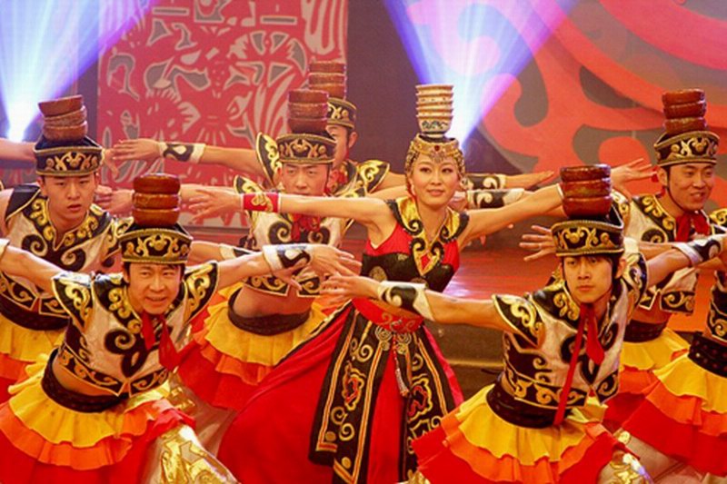 一阵悠扬的乐声中,一群身着大红裙袍的姑娘们,排着整齐的步伐,做着优美的动作。她们的那端庄而富有独特民族风格的舞姿明朗又大方,美丽的脸庞上漾满喜悦的微笑。最令人不断称奇叫绝的是,在那像瀑布般流泻而下的黑色发辫之上,一叠叠高高耸立的白瓷碗稳稳地随着姑娘的身姿飘来移去,像水中的萍,似天上的云,流动的舞姿和静立的碗影,构成一幅美与技完美交织的动感画卷!